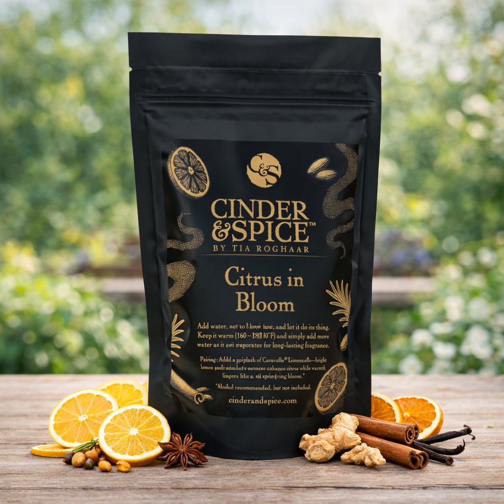 Citrus in Bloom captures the feeling of citrus trees beginning to flower as spring settles in. Lemon and orange slices release vibrant citrus oils that brighten the entire room while cinnamon and ginger bring a gentle warmth beneath the freshness. Finished with pieces of whole vanilla bean, this simmer creates an atmosphere that feels both energizing and comforting—like sunlight and blossoms drifting through an open kitchen window.
